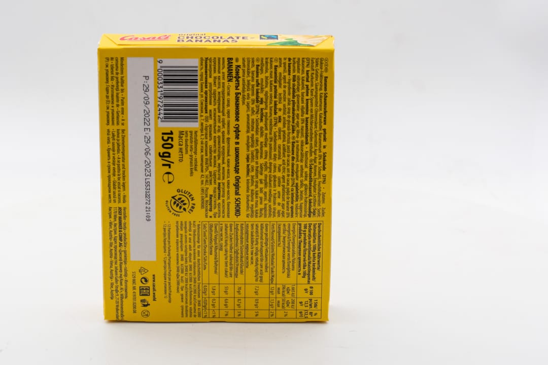 сахар, сироп глюкозно-фруктозный, какао-масса, мякоть банановая, какао-масло, агент влагоудерживающий сорбит, желатин, желирующий агент агар, регулятор кислотности лимонная кислота, ароматизаторы, эмульгатор лецитины, краситель куркумин, крахмал пшеничный. Может содержать незначительное количество молока. Содержит подсластитель.
