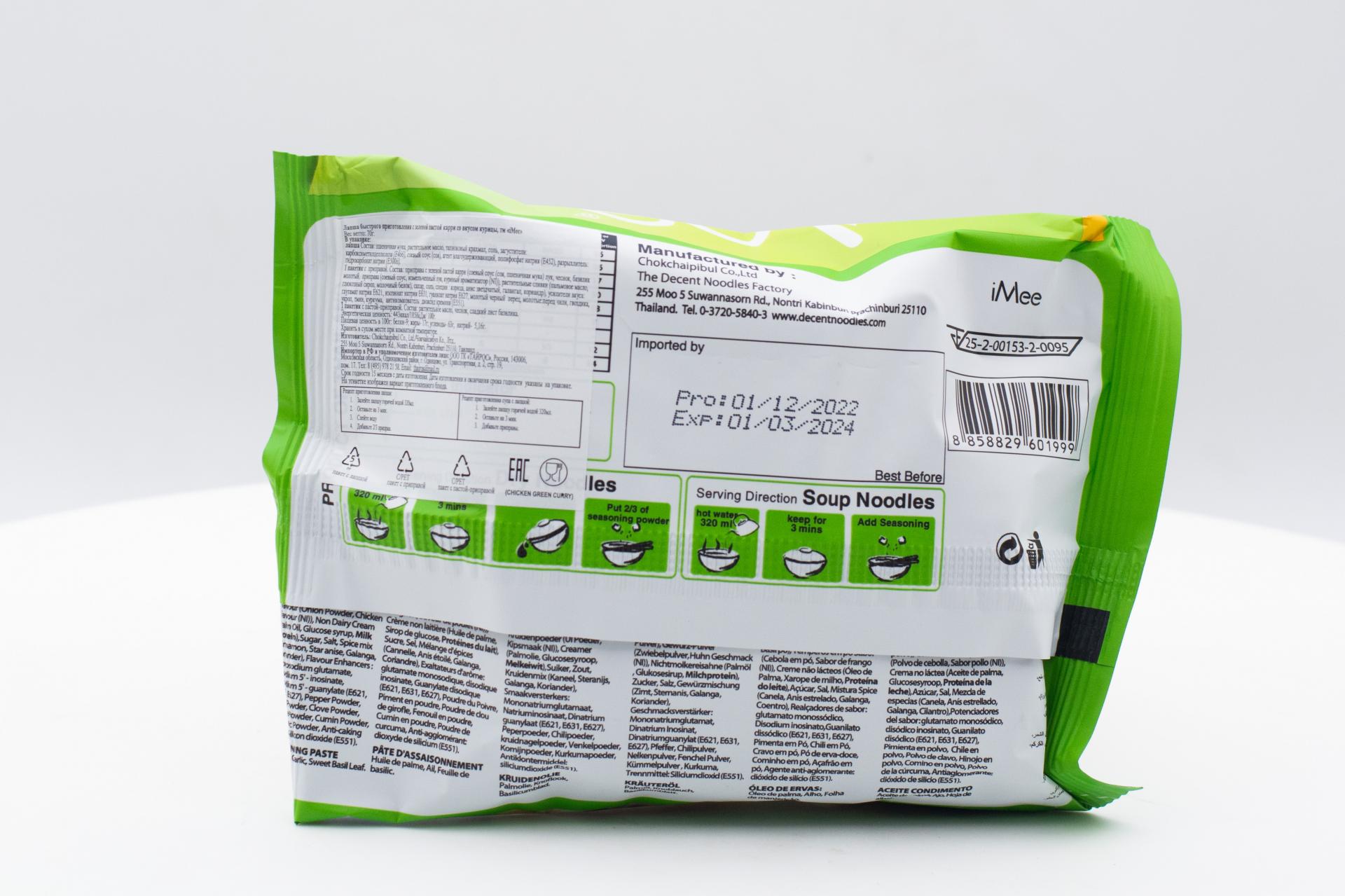 Лапша быстрого приготовления iMee Зеленая Карри Курица - это вкусное и сытное блюдо, которое идеально подходит для быстрого перекуса или полноценного обеда. Упаковка весом 70 грамм содержит ароматную лапшу, пропитанную насыщенным вкусом зеленого карри и курицы. Просто добавьте горячую воду, подождите несколько минут, и наслаждайтесь экзотическим вкусом Таиланда в любое время и в любом месте. Продукт не содержит искусственных красителей и консервантов, что делает его отличным выбором для любителей быстрой и здоровой пищи.