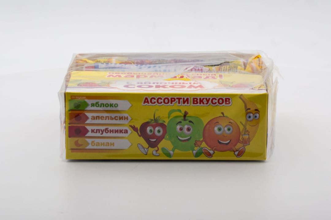 сироп глюкозы, сахар; фруктовый сок 5 % (яблоко, груша, персик, слива, банан), загуститель: крахмал, агент желирующий: желатин; регулятор кислотности: лимонная кислота; красители пищевые натуральные: экстракт куркумы (e100), кармины (e120), медные комплексы хлорофиллинов (е141ii); ароматизаторы: яблоко, банан, апельсин, клубника