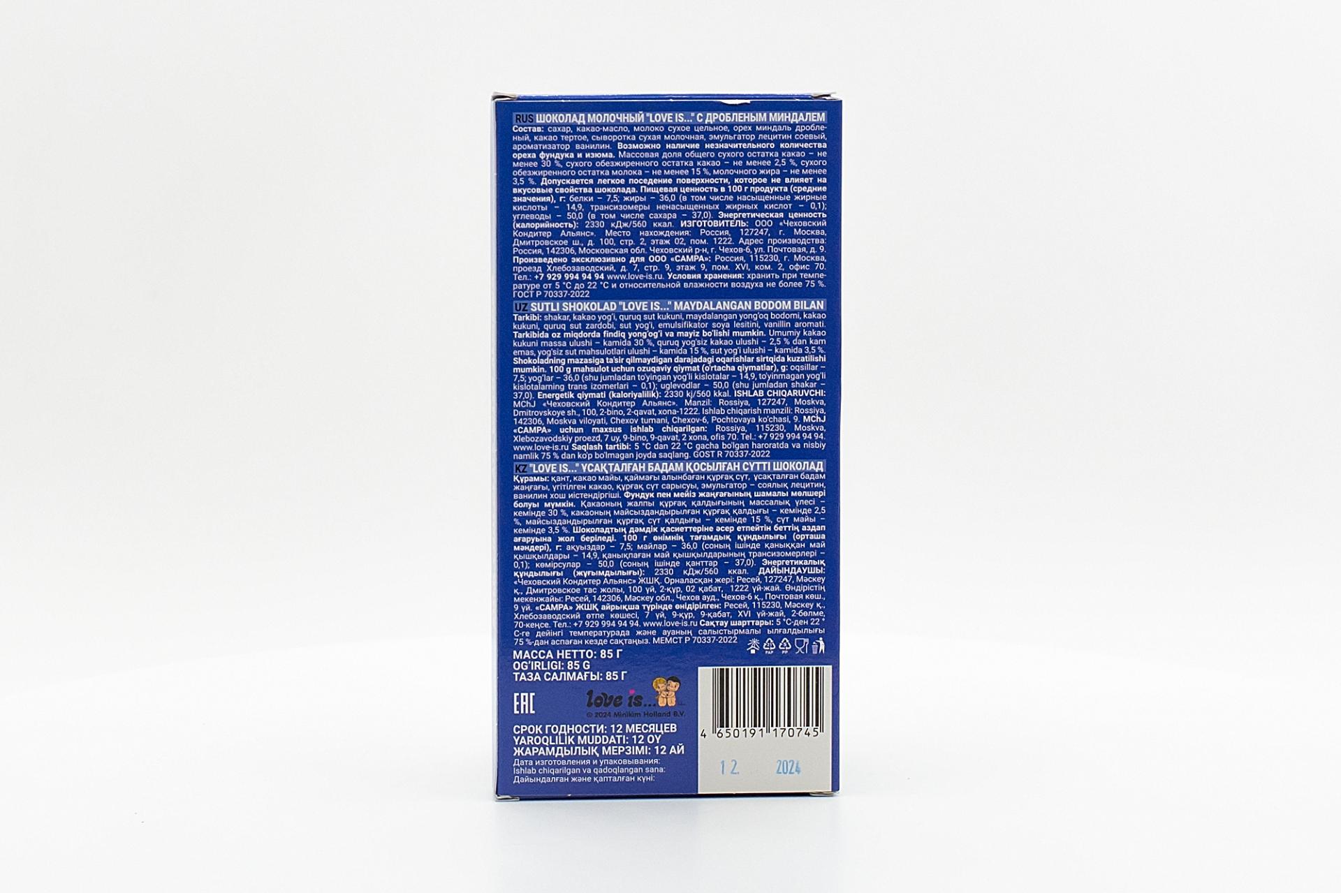 Шоколад Love is молочный с дробленым миндалем 85 гр0,00 руб. за штуку (в упак. 12 шт.) |