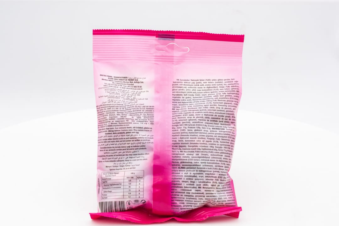 мягкая карамель (92%): сахар, сироп глюкозы, растительный жир (пальмовый), увлажнители (сорбит), желатин, регулятор кислотности (лимонная кислота), ароматизаторы (клубника), соль, эмульгатор (соевый лецитин, моно- и диглицериды жирных кислот). Начинка (8%): декстроза, сироп глюкозы, сахар, концентрат фруктового сока (10%), увлажнители (глицерин), регулятор кислотности (лимонная кислота), загуститель (пектин), ароматизаторы (клубника).