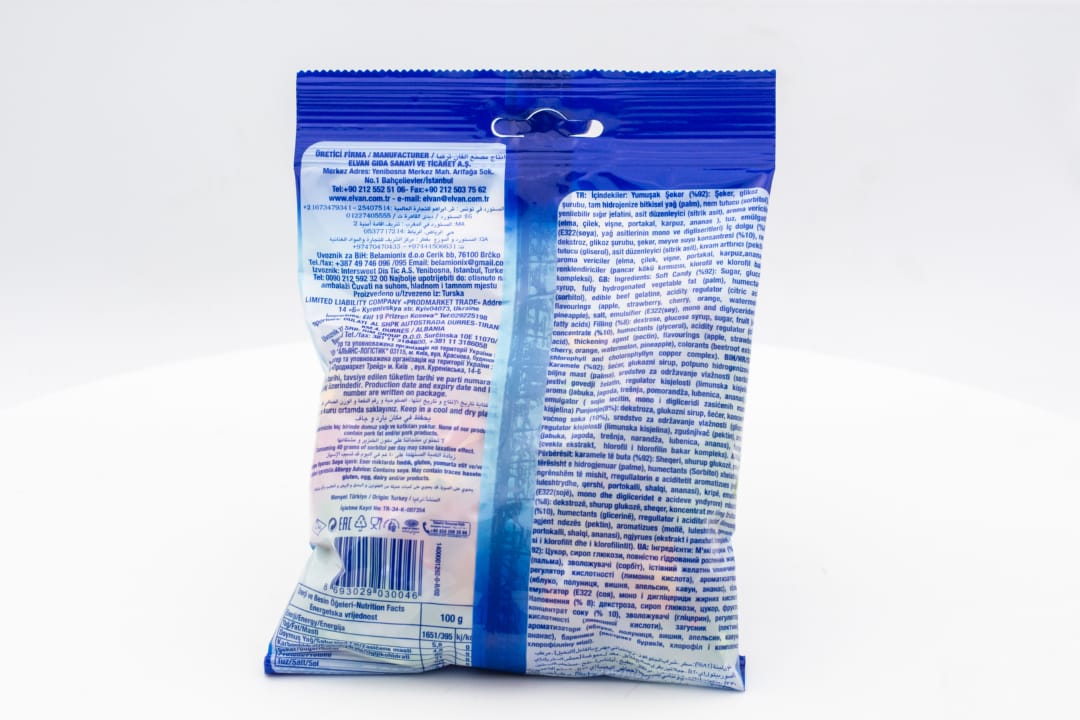 мягкая карамель (92%): сахар, сироп глюкозы, растительный жир (пальмовый), увлажнители (сорбит), желатин, регулятор кислотности (лимонная кислота), ароматизаторы (яблоко, клубника, вишня, апельсин, арбуз, ананас), соль, эмульгатор (соевый лецитин, моно- и диглицериды жирных кислот). Начинка (8%): декстроза, сироп глюкозы, сахар, концентрат фруктового сока (10%), увлажнители (глицерин), регулятор кислотности (лимонная кислота) ), загуститель (пектин), ароматизаторы (яблоко, клубника, вишня, апельсин, арбуз, ананас), красители (экстракт свеклы, хлорофилл и хлорофиллин медный комплекс).